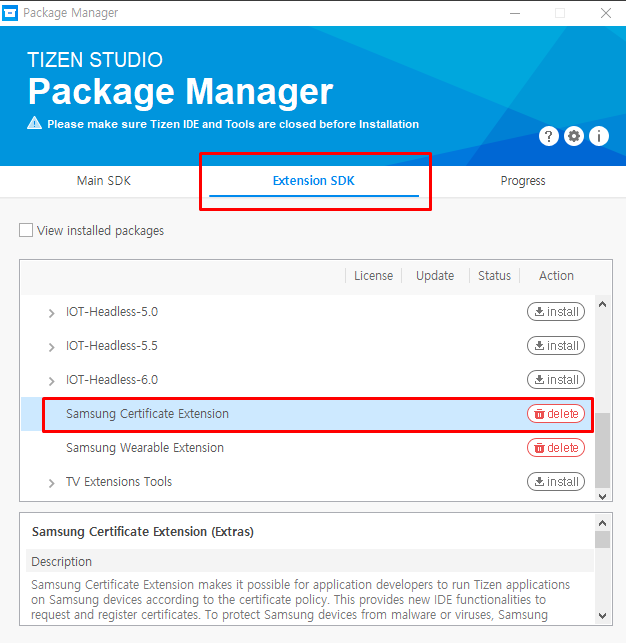 1. Tizen Package Manger 를 열고, Extension SDK 에서 Samsung Certificate Extension 을 설치한다.