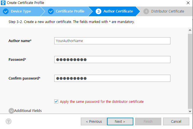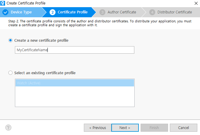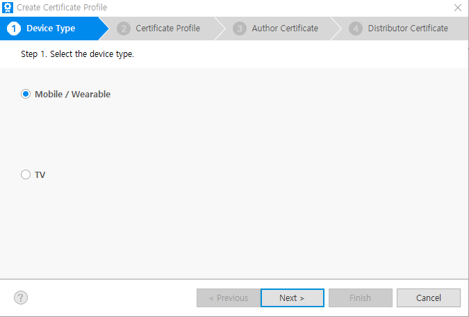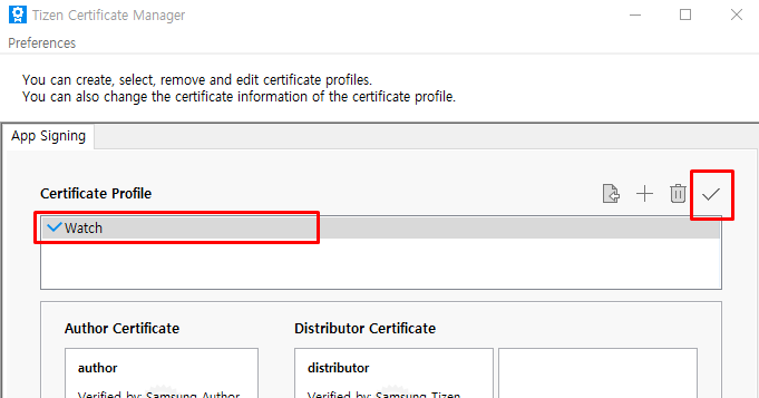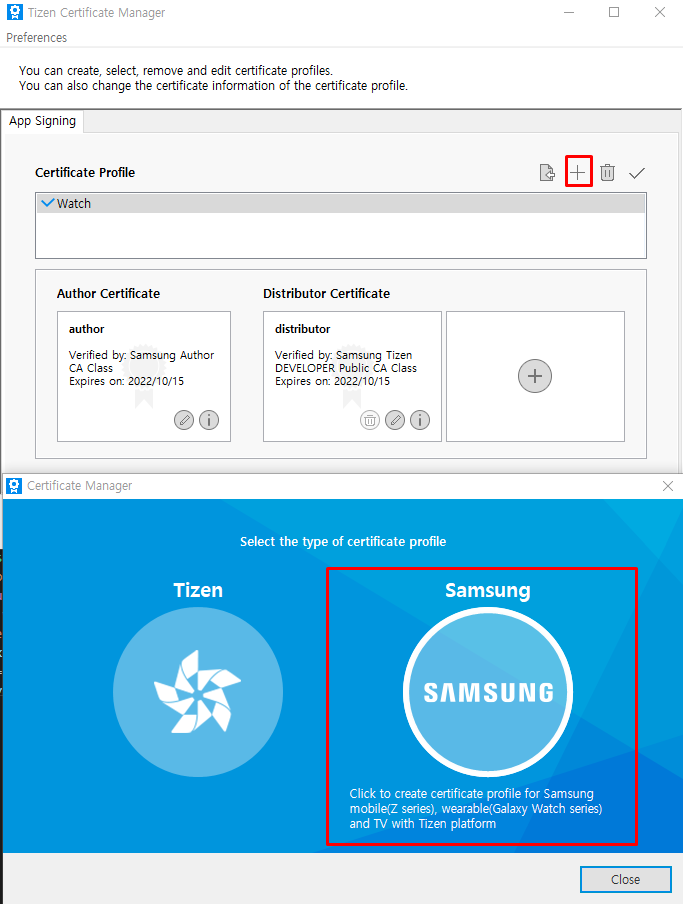 2. Tizen Certificate Manager 를 열고, + 를 눌러 새로운 인증서 프로필 작성을 시작한다.