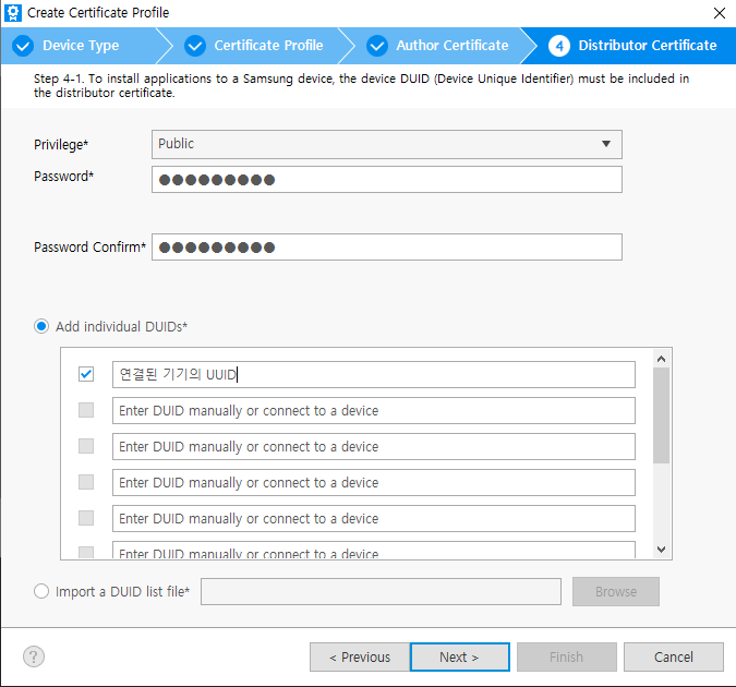 테스트할 기기가 연결된 상태라면, 인증서에 등록될 기기의 UUID가 자동으로 표시 됨.